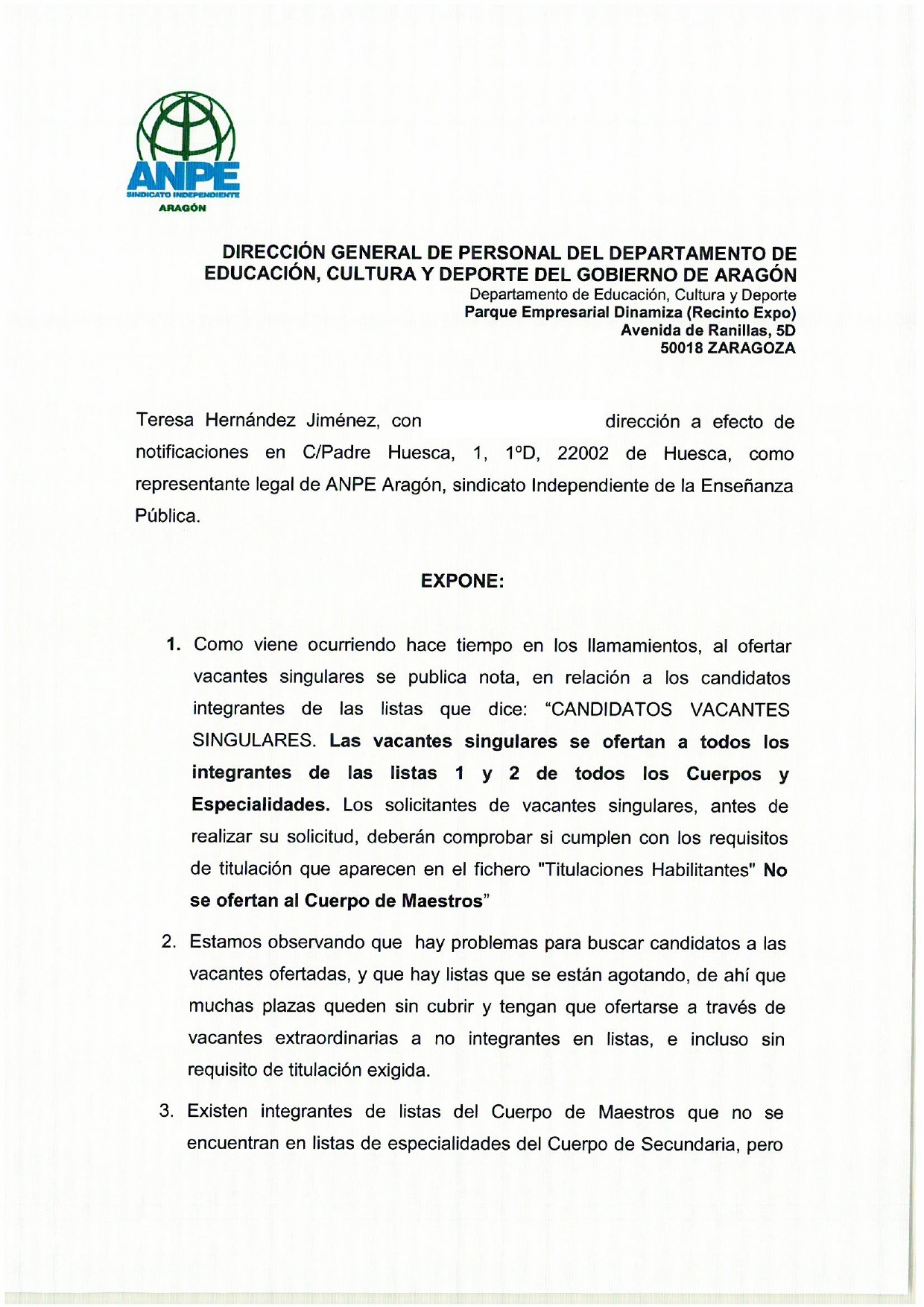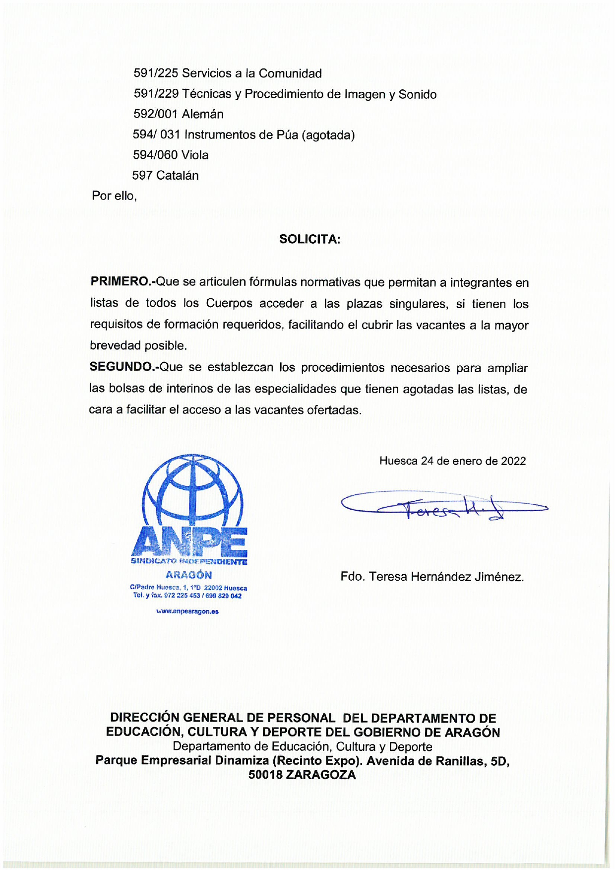 ANPE Aragón ha presentado hoy, 24 de enero de 2022, escrito dirigido a la DG de Personal, por el que se solicita: