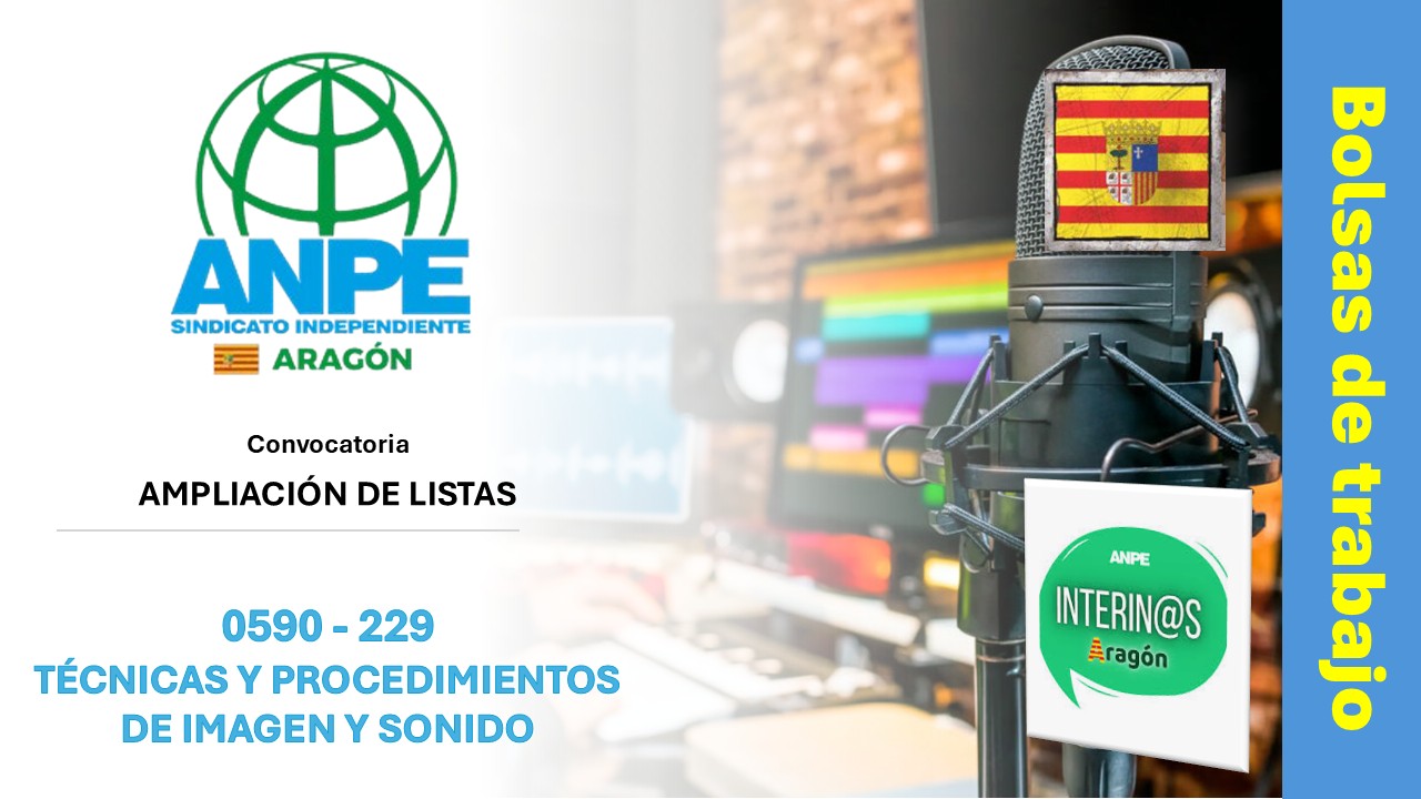 El Departamento de Educación de Aragón ha convocado un procedimiento de ampliación de listas de espera para la especialidad de Técnicas y Procedimientos de Imagen y Sonido (0590-229) del Cuerpo de Profesores de Enseñanza Secundaria. La convocatoria se realiza ante la falta de personal suficiente en la lista vigente y se rige por el Decreto 31/2016. El plazo de inscripción telemática se abre del 23 de enero al 3 de febrero de 2026, con acto de presentación presencial el 6 de febrero en Zaragoza, a las 16:00 horas, en el Departamento de Educación, Cultura y Deporte, situado en Avenida Ranillas 5D.