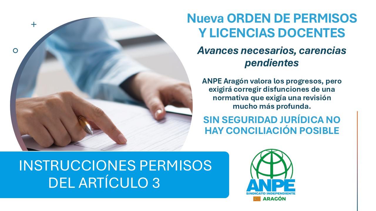 Los permisos merecían una revisión mucho más trabajada, sistemática y técnicamente depurada de la ofrecida desde la Mesa Sectorial, de la que ANPE Aragón no forma parte, con este texto parcheado de instrucciones atomizadas. SIN SEGURIDAD JURÍDICA NO HAY CONCILIACIÓN POSIBLE para los docentes de la Educación Pública.