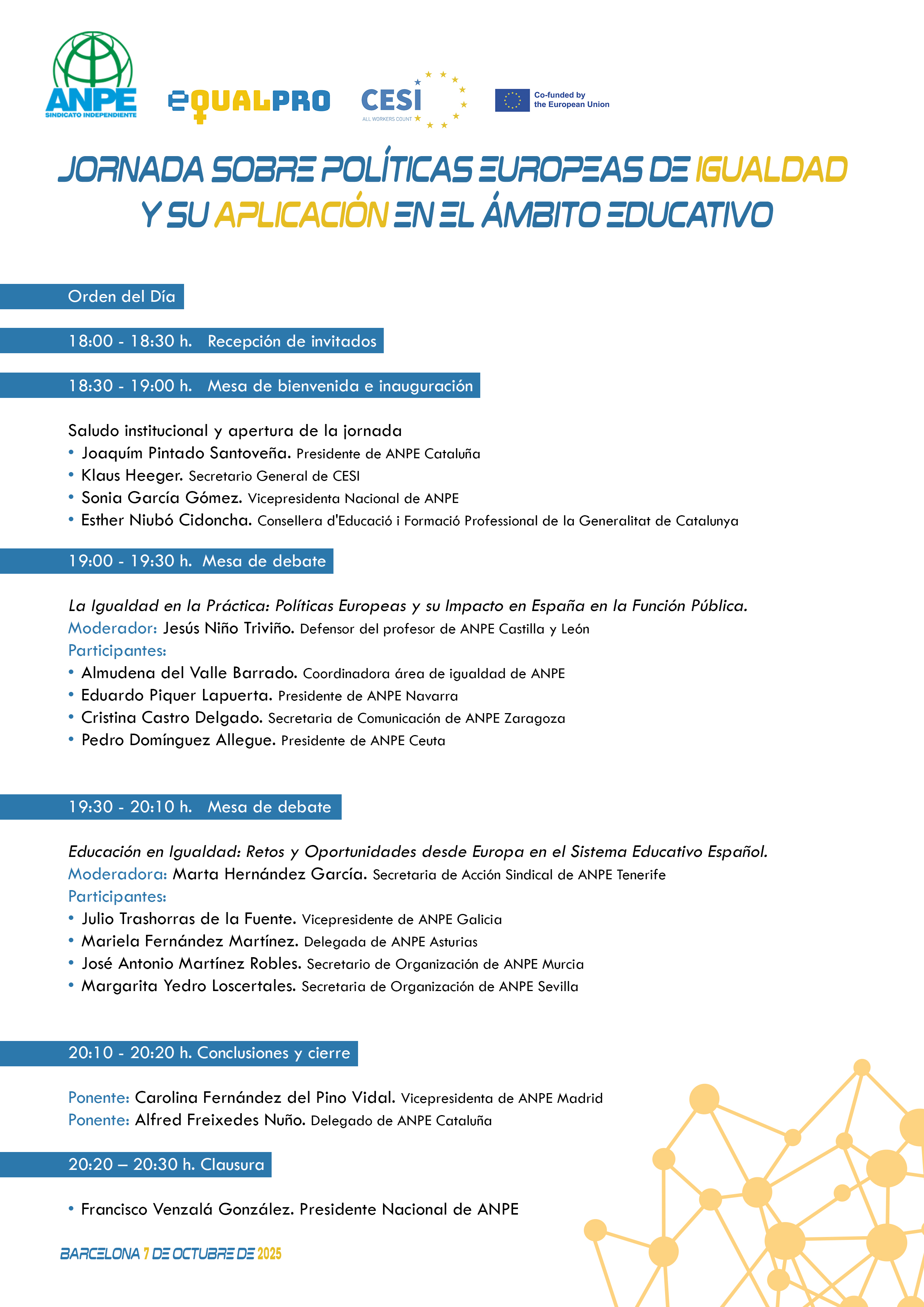 Intervinieron en la jornada, entre otros, la consellera d'Educació i Formació Professional de la Generalitat de Catalunya, Esther Niubó; el presidente y la vicepresidenta nacional de ANPE, Francisco Venzalá y Sonia García, respectivamente; el secretario general de CESI, Klaus Heeger; y el presidente de ANPE Cataluña, Joaquim Pintado.
