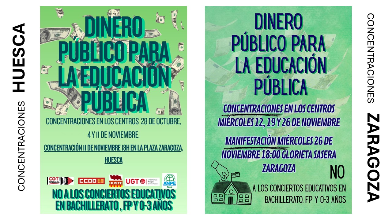 Así mismo, esa misma tarde a las 18:00 horas en la Plaza Zaragoza de Huesca y a las 19:00 horas en el Ayuntamiento de Jaca, se convoca una concentración para toda la comunidad educativa y exigir que se paralicen los nuevos conciertos educativos y defender unidos la educación pública.