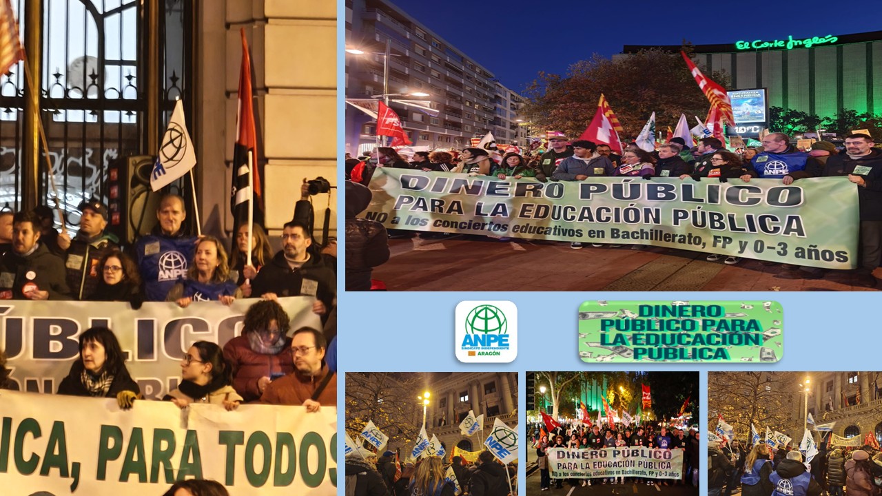Bajo el lema «¡Dinero público para la educación pública!», ANPE Aragón promueve, se suma y apoya estas movilizaciones en defensa de un sistema educativo equitativo, con recursos suficientes y libre de recortes encubiertos. ¡Confrontemos más unidos que nunca esta lamentable INVERSIÓN DE LAS PRIORIDADES del Departamento de Educación!: ¡DINERO PÚBLICO PARA LA EDUCACIÓN PÚBLICA!