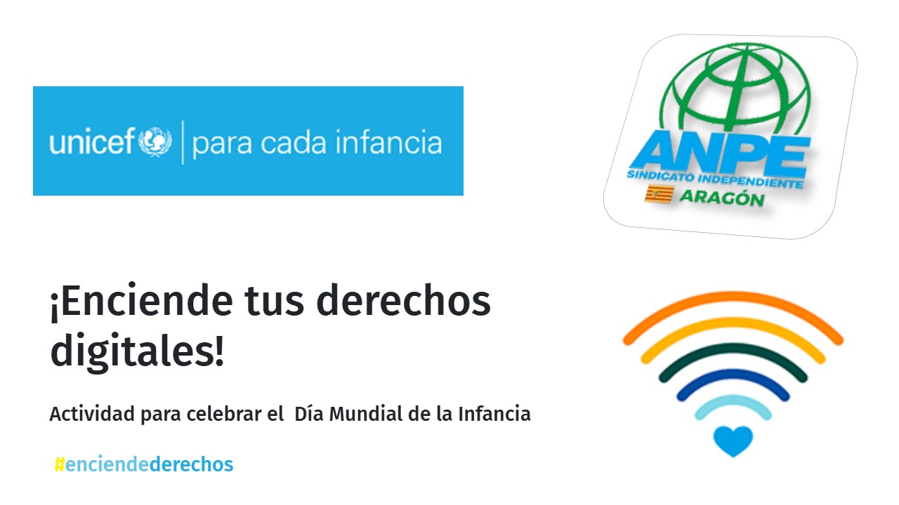 ANPE Aragón colabora en la difusión de la actividad educativa “Enciende tus derechos digitales” promovida por UNICEF con motivo de la próxima celebración del Día Mundial de la Infancia (20 de noviembre). Esta iniciativa invita a la comunidad escolar a reflexionar sobre los derechos digitales de niños, niñas y adolescentes y a comprometerse con su protección y uso responsable en el entorno digital.