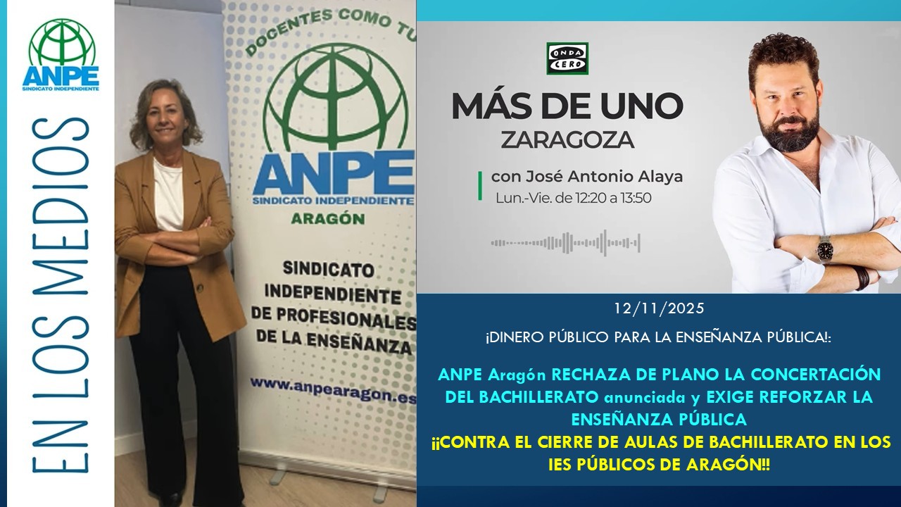 En su entrevista en el programa “Más de uno Zaragoza” con José Antonio Alaya, Teresa Hernández, presidenta de ANPE Aragón, explicó los motivos que impulsan las concentraciones educativas de los martes bajo el lema «¡Dinero público para la educación pública!». Hernández subrayó que estas movilizaciones son una respuesta unitaria de la comunidad educativa aragonesa —docentes, familias y sindicatos— ante la intención del Gobierno de Aragón de concertar el Bachillerato y extender los conciertos educativos a la etapa de 0 a 3 años.
