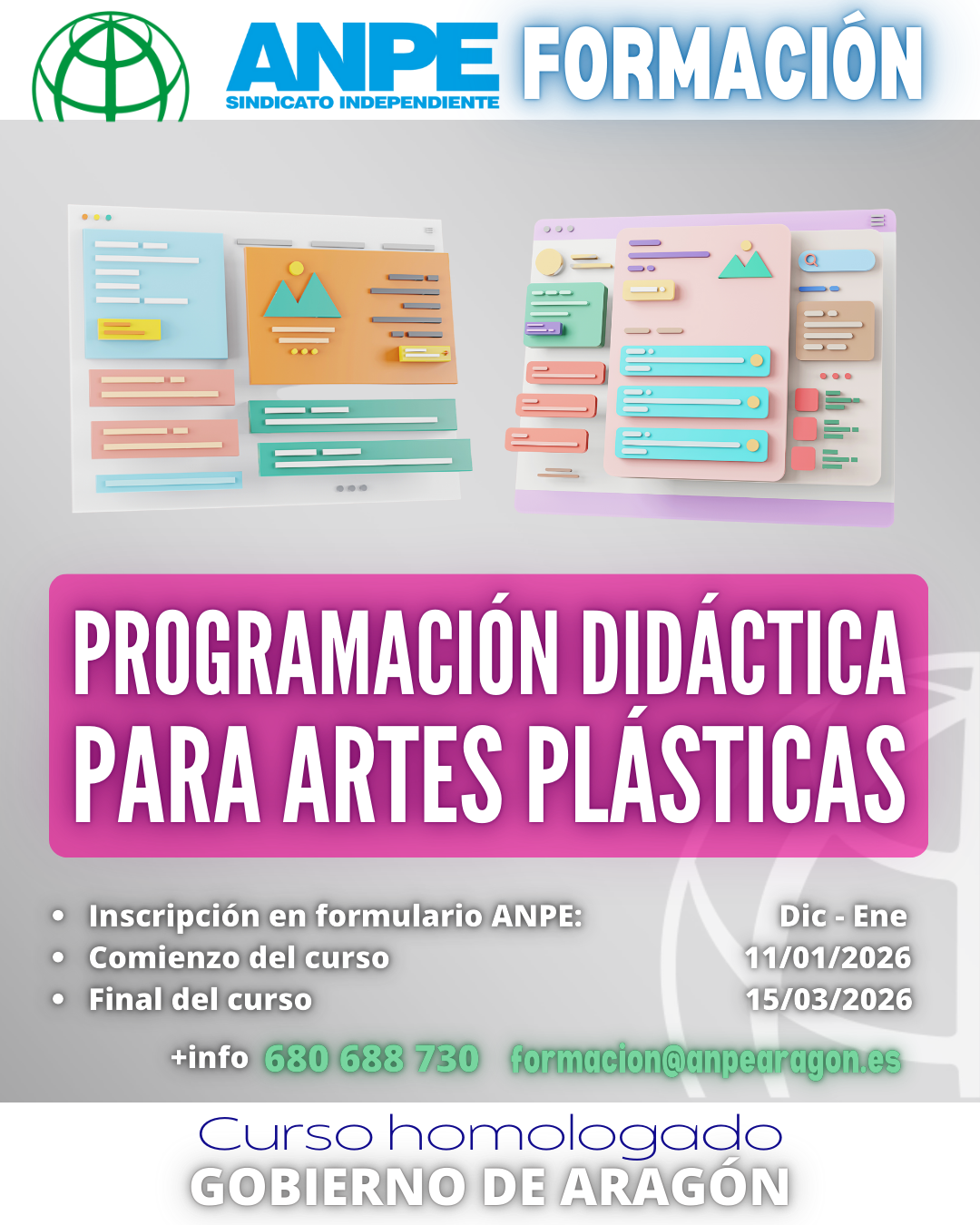 Los cursos de unidades didácticas de ANPE Aragón, que se impartirán del 11 de enero al 15 de marzo, están diseñados y orientados a la preparación y ensayo de la defensa de la programación didáctica para las oposiciones de Artes Plásticas y Diseño de cualquier comunidad autónoma.