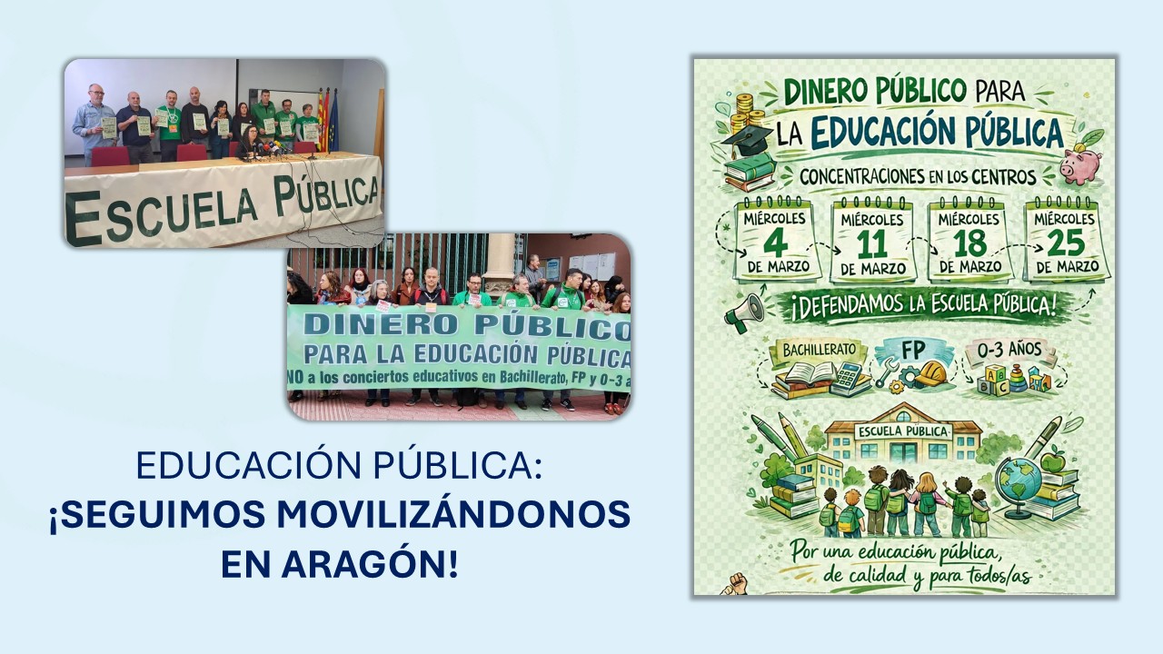 ANPE Aragón ha participado este miércoles 4 de marzo en las concentraciones convocadas en distintos centros educativos aragoneses en defensa de la escuela pública, en convocatoria unitaria junto a todas las restantes organizaciones sindicales de educación pública y restantes entidades, alumnado y familias. Durante las movilizaciones, el sindicato ha reiterado la necesidad de priorizar la inversión en la red pública mediante una financiación suficiente, más recursos educativos y la cobertura adecuada de las plantillas docentes. ANPE Aragón ha defendido que el dinero público debe destinarse en primer lugar a reforzar los centros públicos y garantizar profesorado suficiente y condiciones adecuadas de enseñanza, antes de ampliar concertaciones en etapas educativas no obligatorias.
