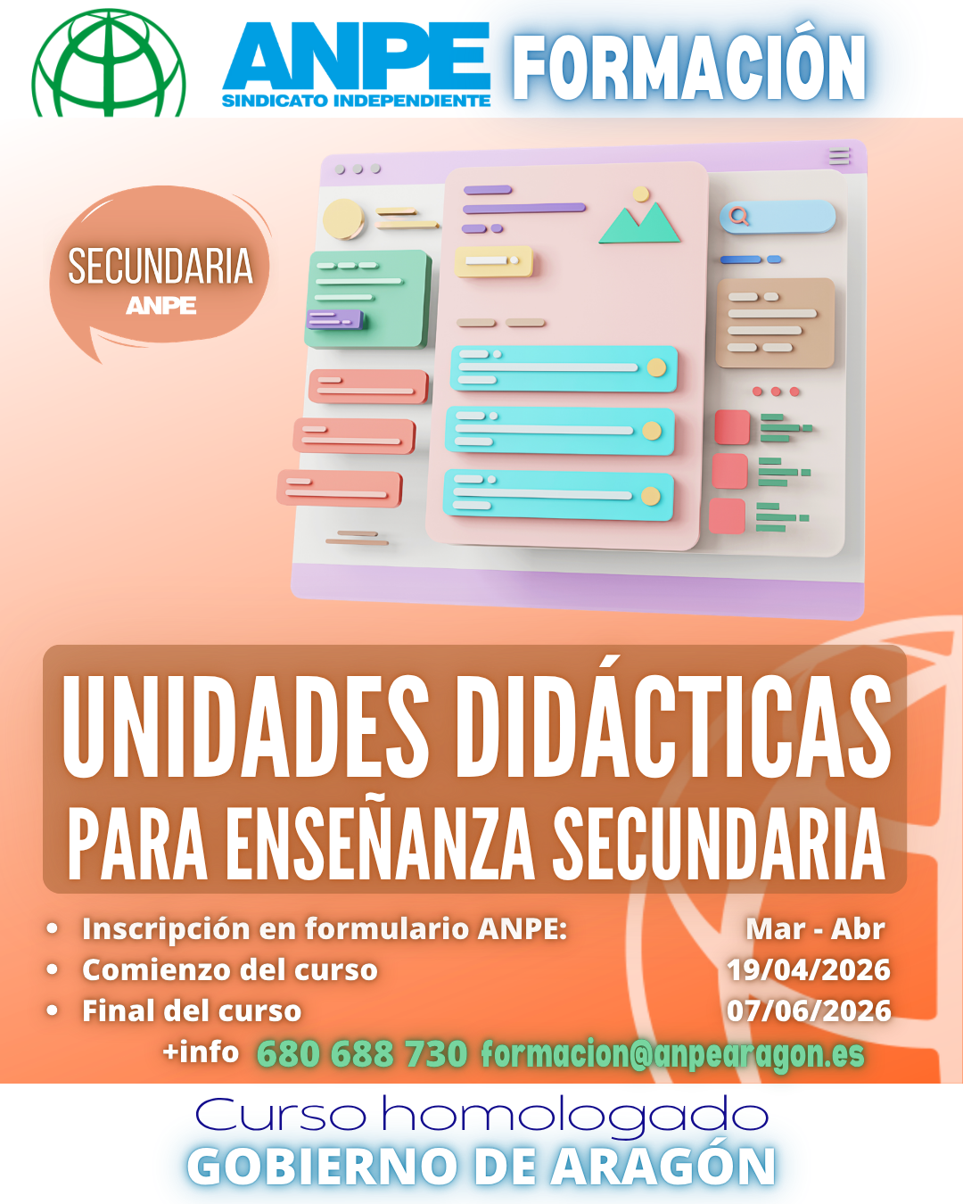 Llama por teléfono 680 688 730 o escribe al correo formacion@anpearagon.es para más información o incidencias con la matriculación del curso.