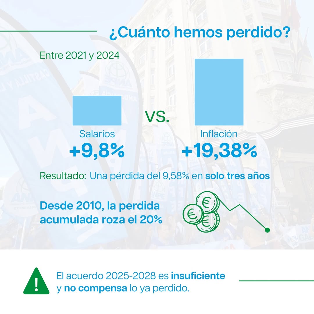 Los datos disponibles reflejan que entre 2021 y 2024, los salarios públicos subieron un 9,8%, absolutamente insuficiente frente a una inflación acumulada del 19,38%, lo que ha supuesto una pérdida de poder adquisitivo del 9,58%. Ni siquiera con todas las subidas pactadas hasta 2028 se recuperará el poder adquisitivo perdido hasta 2025 pues el IPC acumulado hasta el momento supera incluso el total de subidas previstas hasta 2028.