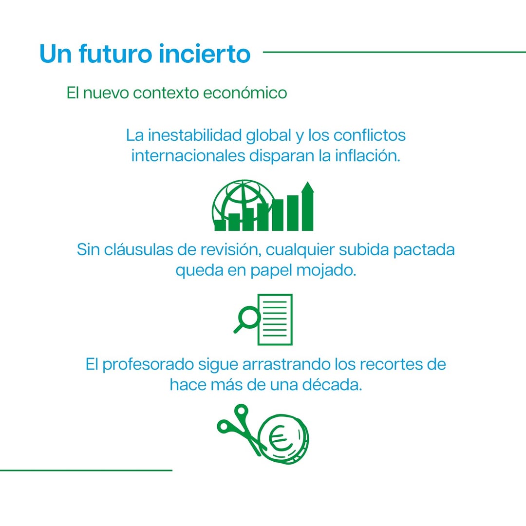 Para ANPE, la situación actual muestra cómo, en un escenario de inestabilidad económica y política global, la inexistencia de una cláusula de revisión salarial vinculada directamente al IPC lastra la eficacia cualquier subida pactada, como sucedió con el acuerdo 2022-2024 y el riesgo de nuevas pérdidas salariales que se sumaría a la acumulada por el profesorado y el resto del personal público desde los recortes de 2010.