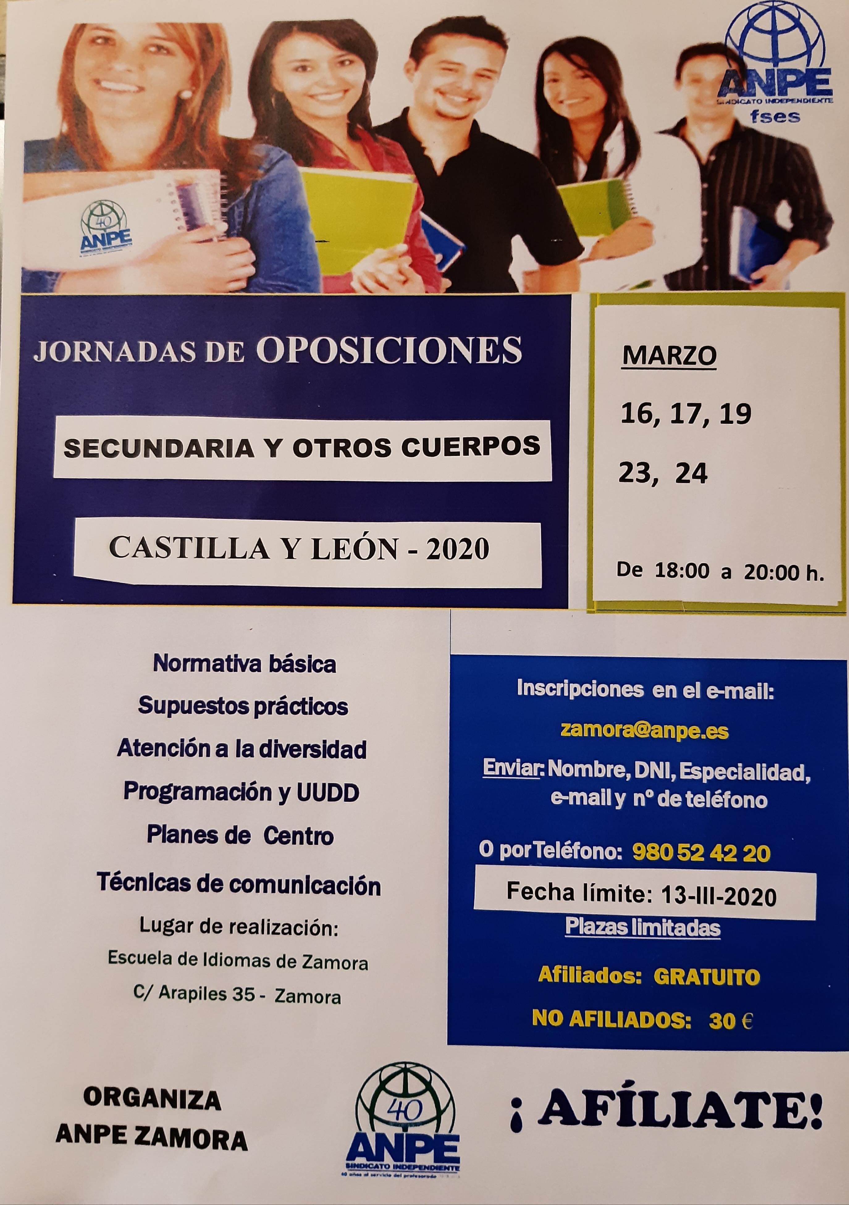 ANPE ZAMORA  organiza Jornadas de Oposiciones Secundaria y Otros Cuerpos -Marzo 2020 Fechas:  Del 16  al 24  de marzo de 2020. (En  5 sesiones, de 18:00 a 20:00 h.) Inscripción a través de e-mail: zamora@anpe.es   En la sede de ANPE Zamora, o al Tfno: 980 52 42 20