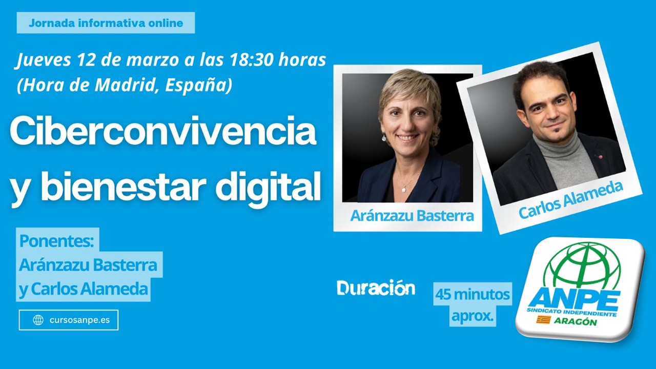 El próximo 12 de marzo, a las 18:30 horas, ANPE celebrará la sesión o jornada informativa en línea «Ciberconvivencia: Estrategias para liderar el bienestar digital en tu centro», dirigida al profesorado, equipos directivos y orientadores.